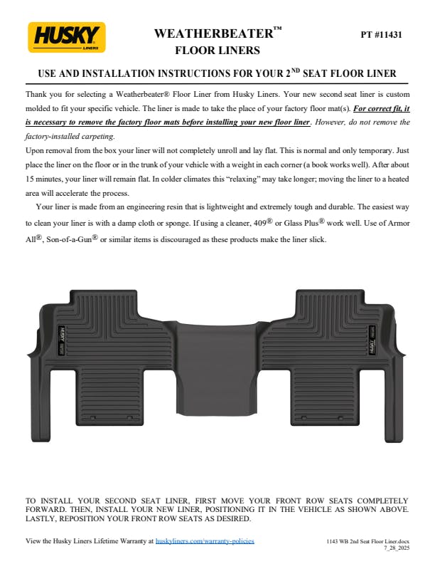 - WeatherBeater(TM) Liners offer protection that extends all the way to your rear seats. So go ahead, lift the seats and leave them up, load after load. Husky's got your floors, and your back, no matter what the road brings your way.