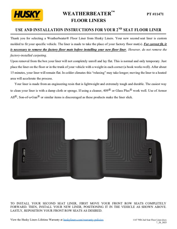 - WeatherBeater(TM) Liners offer protection that extends all the way to your rear seats. So go ahead, lift the seats and leave them up, load after load. Husky's got your floors, and your back, no matter what the road brings your way.