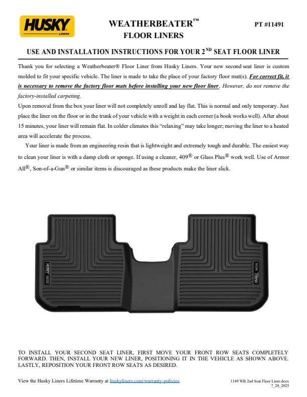- WeatherBeater(TM) Liners offer protection that extends all the way to your rear seats. So go ahead, lift the seats and leave them up, load after load. Husky's got your floors, and your back, no matter what the road brings your way.