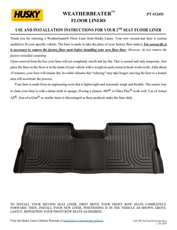 - WeatherBeater(TM) Liners offer protection that extends all the way to your rear seats. So go ahead, lift the seats and leave them up, load after load. Husky's got your floors, and your back, no matter what the road brings your way.