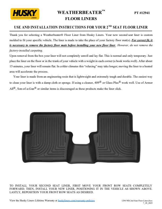 - WeatherBeater(TM) Liners offer protection that extends all the way to your rear seats. So go ahead, lift the seats and leave them up, load after load. Husky's got your floors, and your back, no matter what the road brings your way.