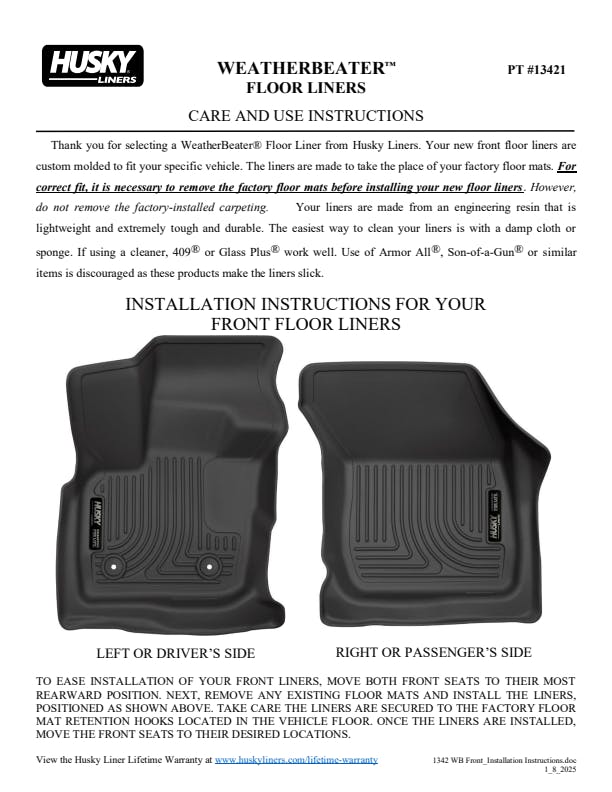 Expand the Husky Liner protection you love from bumper to bumper, with Weatherbeater? Cargo Liners. These all-weather, any-conditions liners are ready for anything you throw in the back and stand up to even the toughest spills. Husky?s rubberized DuraGrip? surface and ProGard? formula keep cargo protected with durable flexibility, and no shifting around. Installs in minutes and stays in place until you?re ready to take out and clean. Available in black, gray, or tan for a factory look to match your vehicle?s interior. Backed by Husky Liners Guaranteed for Life. Proudly made in the U.S.A.