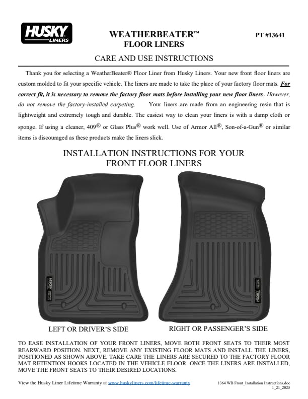 Expand the Husky Liner protection you love from bumper to bumper, with Weatherbeater? Cargo Liners. These all-weather, any-conditions liners are ready for anything you throw in the back and stand up to even the toughest spills. Husky?s rubberized DuraGrip? surface and ProGard? formula keep cargo protected with durable flexibility, and no shifting around. Installs in minutes and stays in place until you?re ready to take out and clean. Available in black, gray, or tan for a factory look to match your vehicle?s interior. Backed by Husky Liners Guaranteed for Life. Proudly made in the U.S.A.