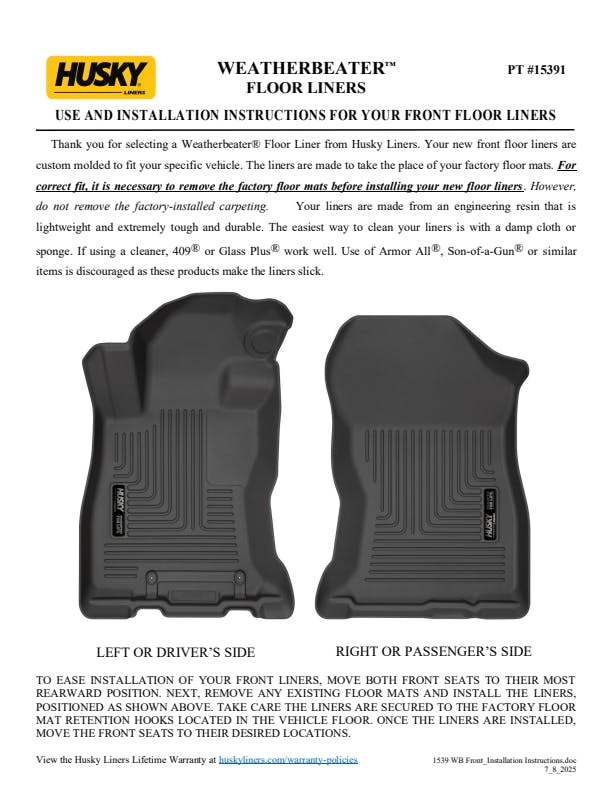 Expand the Husky Liner protection you love from bumper to bumper, with Weatherbeater? Cargo Liners. These all-weather, any-conditions liners are ready for anything you throw in the back and stand up to even the toughest spills. Husky?s rubberized DuraGrip? surface and ProGard? formula keep cargo protected with durable flexibility, and no shifting around. Installs in minutes and stays in place until you?re ready to take out and clean. Available in black, gray, or tan for a factory look to match your vehicle?s interior. Backed by Husky Liners Guaranteed for Life. Proudly made in the U.S.A.