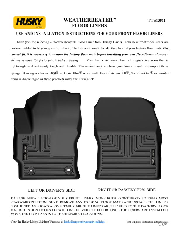 Expand the Husky Liner protection you love from bumper to bumper, with Weatherbeater? Cargo Liners. These all-weather, any-conditions liners are ready for anything you throw in the back and stand up to even the toughest spills. Husky?s rubberized DuraGrip? surface and ProGard? formula keep cargo protected with durable flexibility, and no shifting around. Installs in minutes and stays in place until you?re ready to take out and clean. Available in black, gray, or tan for a factory look to match your vehicle?s interior. Backed by Husky Liners Guaranteed for Life. Proudly made in the U.S.A.