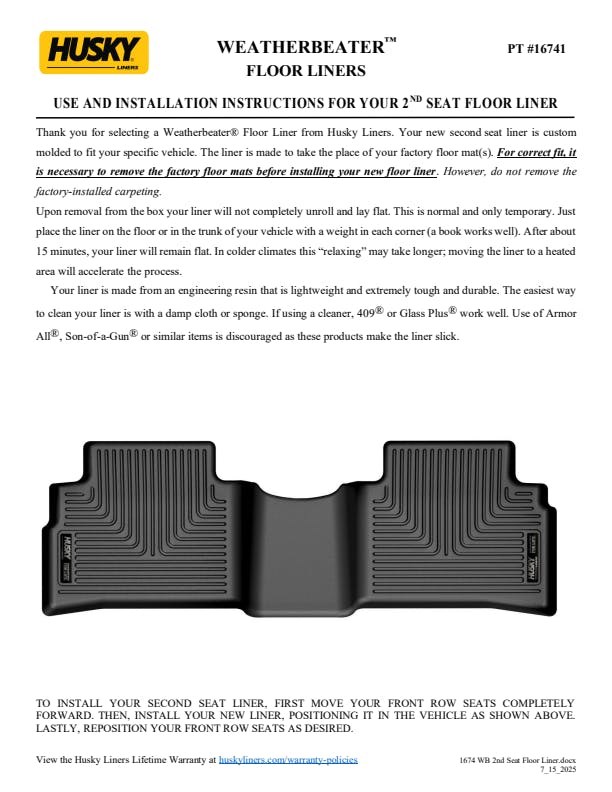 - WeatherBeater(TM) Liners offer protection that extends all the way to your rear seats. So go ahead, lift the seats and leave them up, load after load. Husky's got your floors, and your back, no matter what the road brings your way.
