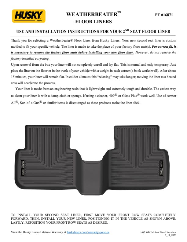 - WeatherBeater(TM) Liners offer protection that extends all the way to your rear seats. So go ahead, lift the seats and leave them up, load after load. Husky's got your floors, and your back, no matter what the road brings your way.