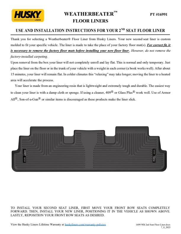 - WeatherBeater(TM) Liners offer protection that extends all the way to your rear seats. So go ahead, lift the seats and leave them up, load after load. Husky's got your floors, and your back, no matter what the road brings your way.