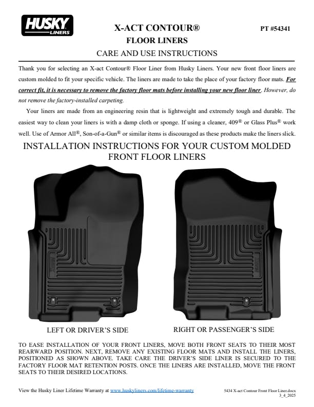 Nothing fits your vehicle better or protects longer than Husky X-act Contour?. These liners combine laser-scanned, exact fit with a no-slip, DuraGrip? surface and a softer feel. Plus, the rock-solid stability delivered by your vehicle?s factory retention posts, and our StayPut? Nibs for a no-slip, no-slide, surface with absolutely zero compromise in protection. They?re built to stand up to whatever you?re laying down? including chemicals like battery acid and oil, with our FormFit Edge? to keep whatever spills contained for easy cleanup. Available in black. Built for a lifetime of rugged abuse, warrantees the same.