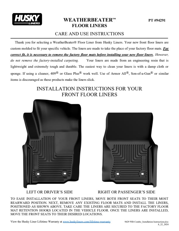 The original all-weather liner is ready, come hell or hot coffee. The Weatherbeater?s construction is a no-slip zone with zero edge curl, and its Stay Put Nibs keep it firmly anchored underfoot. It stands up to chemicals like gas, oil and battery acid, and stays tough and flexible, even under extreme temperatures. Its laser-scanned, FormFit Design? gives your truck, van or SUV an ultra-clean look with easy cleanup to match, while its patented, FormFit Edge? keeps spills contained, carpets unstained. It?s unbeatable Husky protection for life, warrantied the same. Proudly made in the USA.