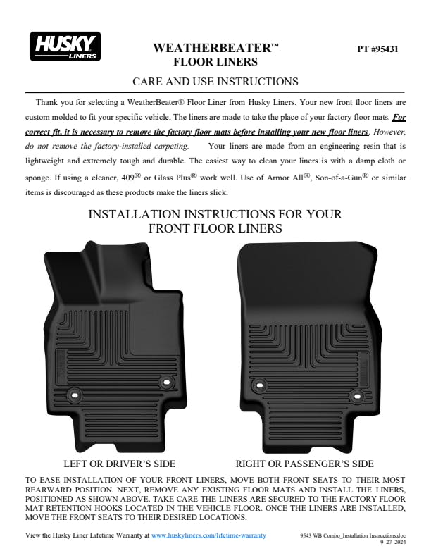 The original all-weather liner is ready, come hell or hot coffee. The Weatherbeater?s construction is a no-slip zone with zero edge curl, and its Stay Put Nibs keep it firmly anchored underfoot. It stands up to chemicals like gas, oil and battery acid, and stays tough and flexible, even under extreme temperatures. Its laser-scanned, FormFit Design? gives your truck, van or SUV an ultra-clean look with easy cleanup to match, while its patented, FormFit Edge? keeps spills contained, carpets unstained. It?s unbeatable Husky protection for life, warrantied the same. Proudly made in the USA.