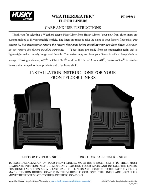The original all-weather liner is ready, come hell or hot coffee. The Weatherbeater?s construction is a no-slip zone with zero edge curl, and its Stay Put Nibs keep it firmly anchored underfoot. It stands up to chemicals like gas, oil and battery acid, and stays tough and flexible, even under extreme temperatures. Its laser-scanned, FormFit Design? gives your truck, van or SUV an ultra-clean look with easy cleanup to match, while its patented, FormFit Edge? keeps spills contained, carpets unstained. It?s unbeatable Husky protection for life, warrantied the same. Proudly made in the USA.
