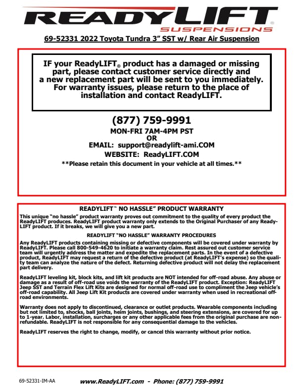 - 3” SST Lift Kit Features and Benefits:;
